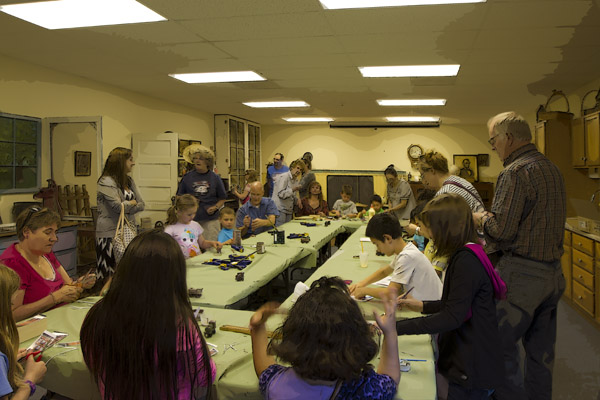 Wooden Railway Clinic - Steilacoom Kids Club. Both of my parents are in this picture, helping children and their parents with creating their train, building and trees at this event. The modular railway was in the wagon shop, a historic building nearby.