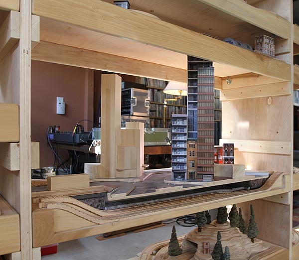 Tee (bottom) with buildings temporarily placed (and extra leg supports stacked)